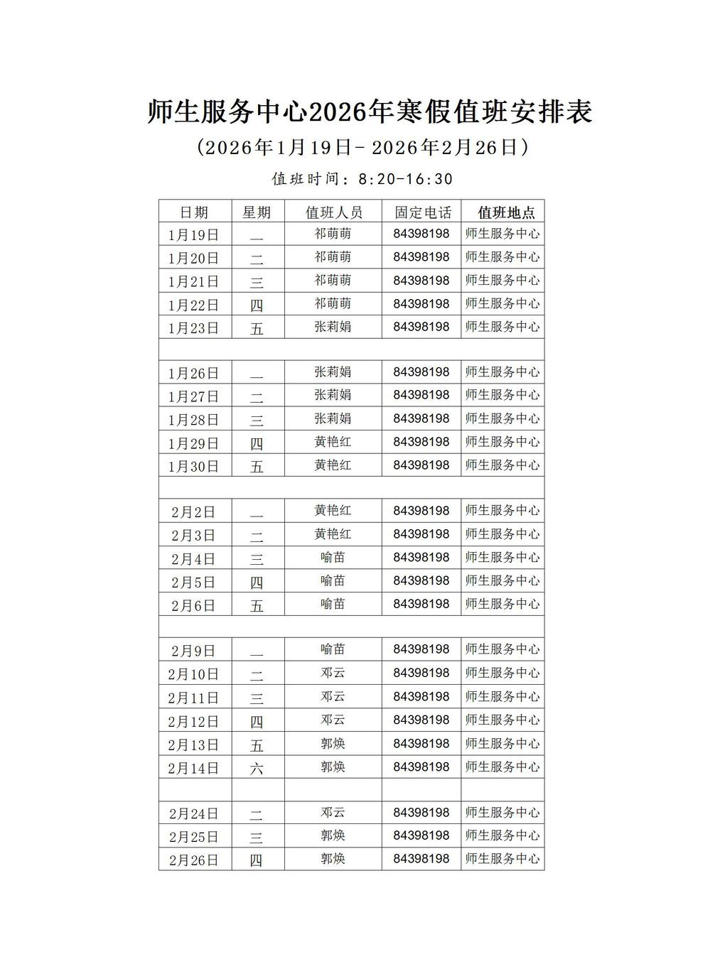 关于师生服务中心2026年寒假值班安排的通知